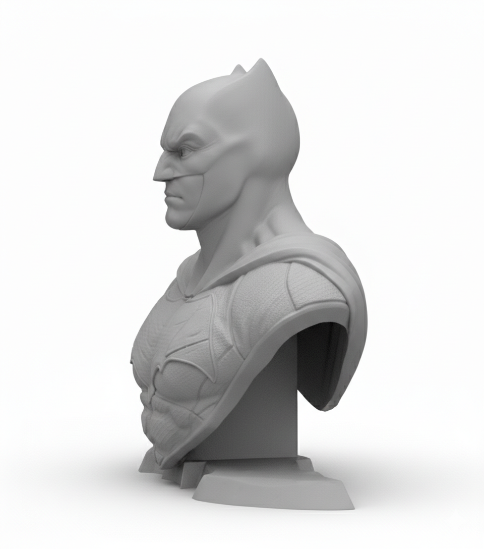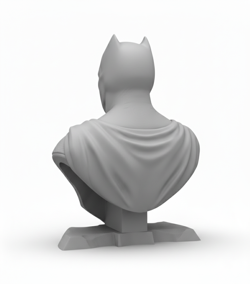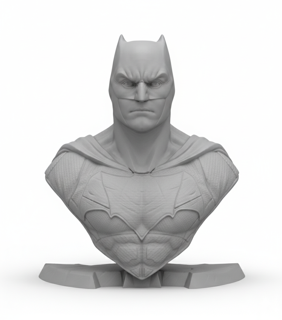 Detalle Inigualable con Tecnología de Resina: En Heroeslab, la calidad es nuestra misión. Este impresionante busto ha sido meticulosamente impreso utilizando las tecnologías de resina (SLA/MSLA) más avanzadas del mercado. Esto nos permite alcanzar un nivel de detalle y precisión que simplemente no es posible con otros métodos de impresión 3D. Observa cada arruga de la frente, la textura de la capa y el intrincado diseño del emblema del murciélago en el pecho. La superficie lisa y refinada de la resina proporciona una base impecable para el siguiente paso: ¡tu toque artístico!